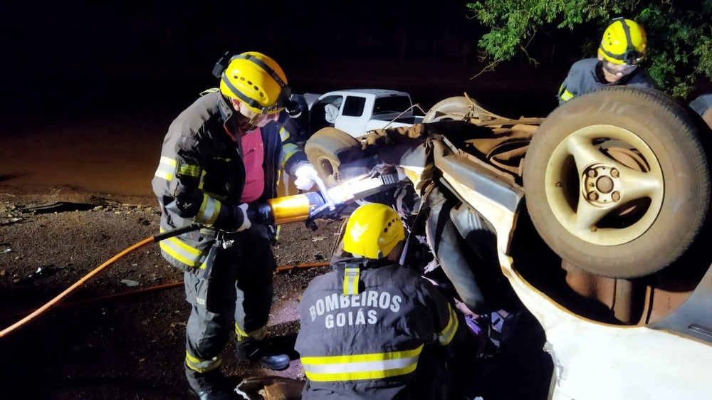 | Bombeiros utilizaram o aparelho desencarcerador e técnicas de salvamento veicular para retirar as vítimas. — Foto: Divulgação/CBM-GO |