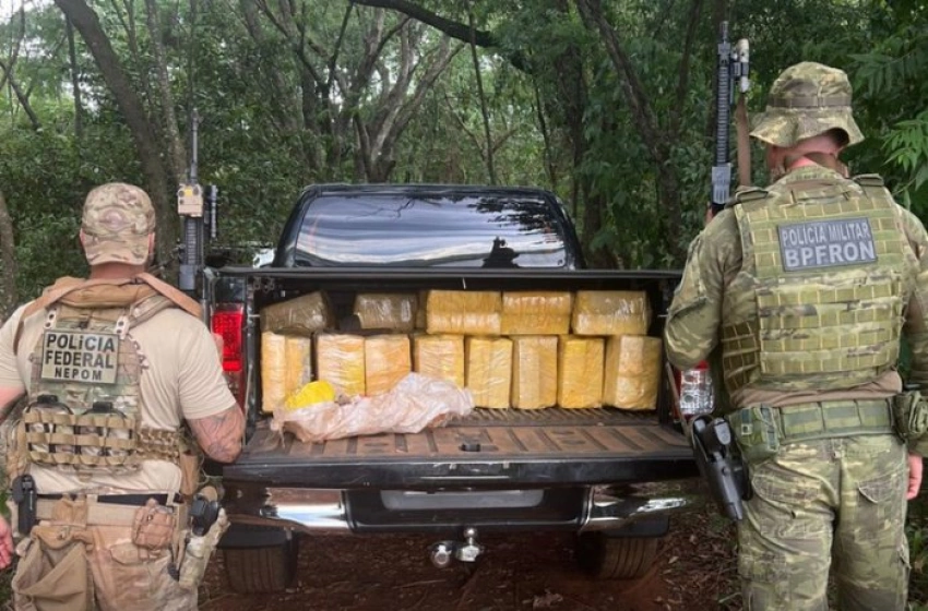 Os policiais identificaram uma caminhonete preta, com placas brasileiras, circulando em alta velocidade pelas vias vicinais do distrito de Sub-Sede. Com a movimentação suspeita, a equipe policial, formada por integrantes da PF e do BPFron, se dirigiram pela mata até o ponto de parada do veículo, onde era carregado com volumes envoltos por uma sacola plástica amarela por diversos indivíduos.